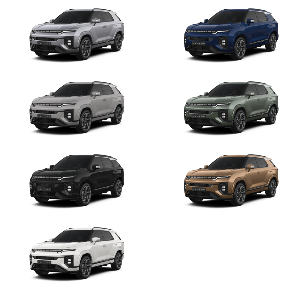 2025 액티언 색상은 화이트, 블랙, 로얄쿠퍼, 아이언 메탈, 라떼 그레이지, 포레스트그린, 댄디블루 총 7 컬러 사양이 있습니다.